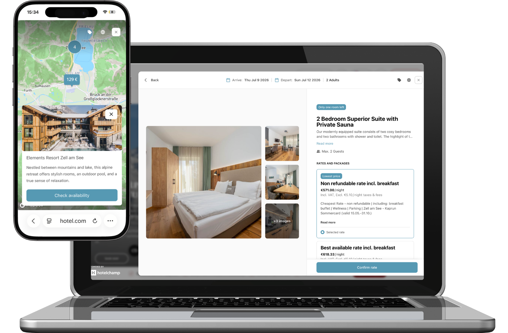 Built to convert and designed for your guests, the Hotelchamp Booking Engine delivers an app-like booking flow — with no redirects, no loading time, and the ease and trust needed to turn lookers into bookers.