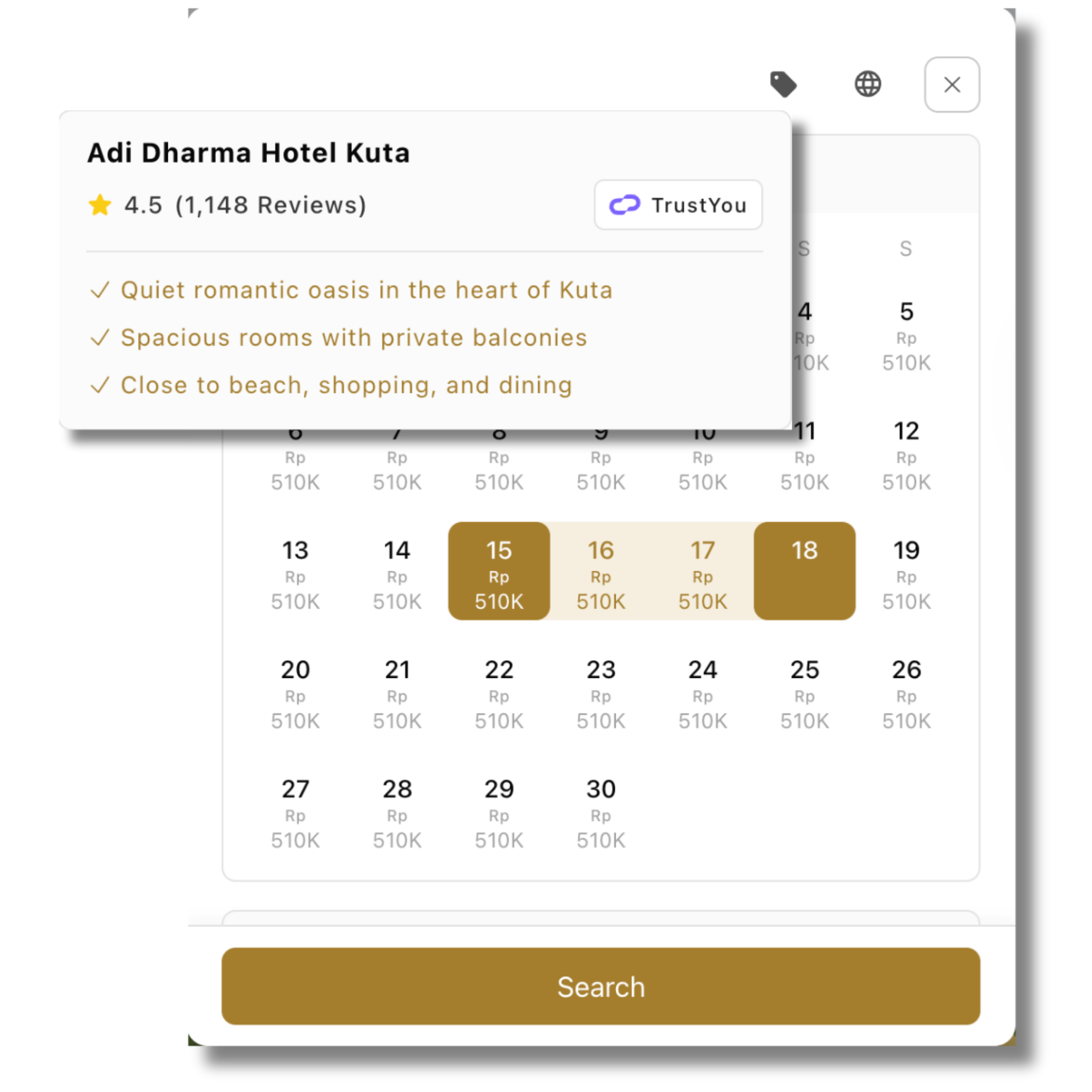 With a chain-level date picker and automatic property detection, your guests can switch between hotels in the booking engine at any time, with no friction. All their details automatically carry over. Think dates, guest count, and promo codes—no reselection needed.